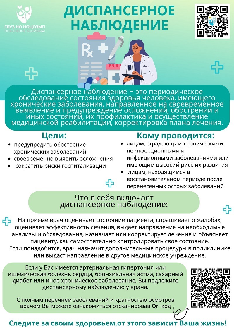 В рамках диспансерного наблюдения пациенты проходят периодические медицинские обследования, которые включают консультации врача, профилактические осмотры, диагностические исследования, амбулаторное и стационарное лечение, рекомендации по вторичной профилактике.
