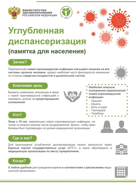 Углубленная диспансеризация направлена на выявление и профилактику осложнений после перенесённой новой коронавирусной инфекции COVID-19 и состоит из двух этапов.